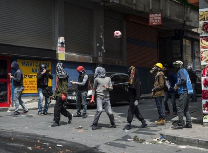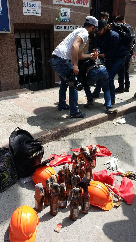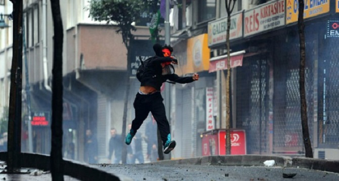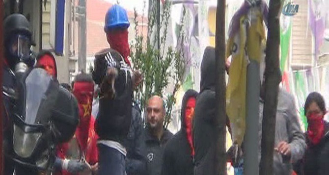 Grup ise polise havai fişek, molotof kokteyli ve taşlarla karşılık verdi. Bazı göstericilerin ise ses bombası attığı görüldü.