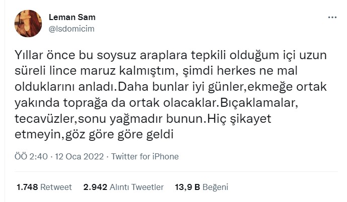 Leman Sam sosyal medya hesabından yaptığı paylaşımlarda, “Yıllar önce bu soysuz Araplara tepkili olduğum içi uzun süreli lince maruz kalmıştım, şimdi herkes ne mal olduklarını anladı. Daha bunlar iyi günler, ekmeğe ortak yakında toprağa da ortak olacaklar. Bıçaklamalar, tecavüzler, sonu yağmadır bunun. Hiç şikayet etmeyin, göz göre göre geldi” ifadelerini kullanarak yıllar geçse dahi nasıl uygar ve medeni olunamayacağını gösterdi.