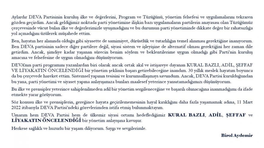 Deva Partisi Genel Başkan Yardımcısı Birol Aydemir'in istifa metni,