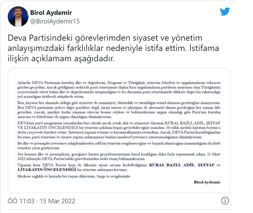 DEVA Partisi Genel Başkan Yardımcısı Birol Aydemir partisinden istifa etti. Aydemir: “Umarım hem DEVA Partisi hem de ülkemiz siyasi ortamı hedeflediğimiz liyakatın öncelendiği bir yönetim anlayışına kavuşur.” siteminde bulundu.