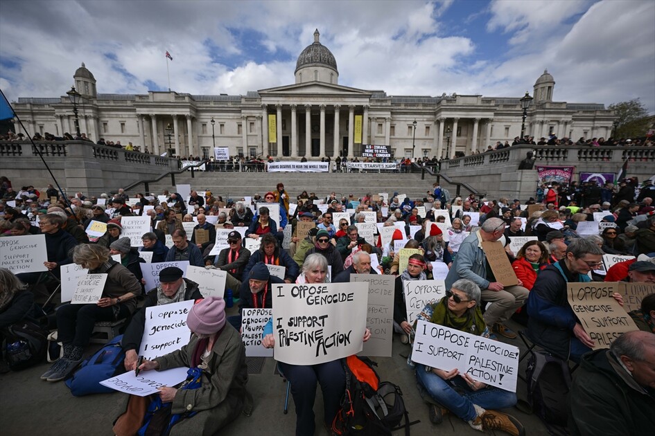 "Palestine Action" grubunun yasaklı örgüt ilan edilmesine tepki gösteren yaklaşık 500 kişi, yanlarında getirdikleri boş karton ve pankartlara, "Soykırıma karşıyım, Palestine Action'ı destekliyorum" yazarak, kentin ünlü Trafalgar Meydanı’nda oturma eylemi düzenledi.