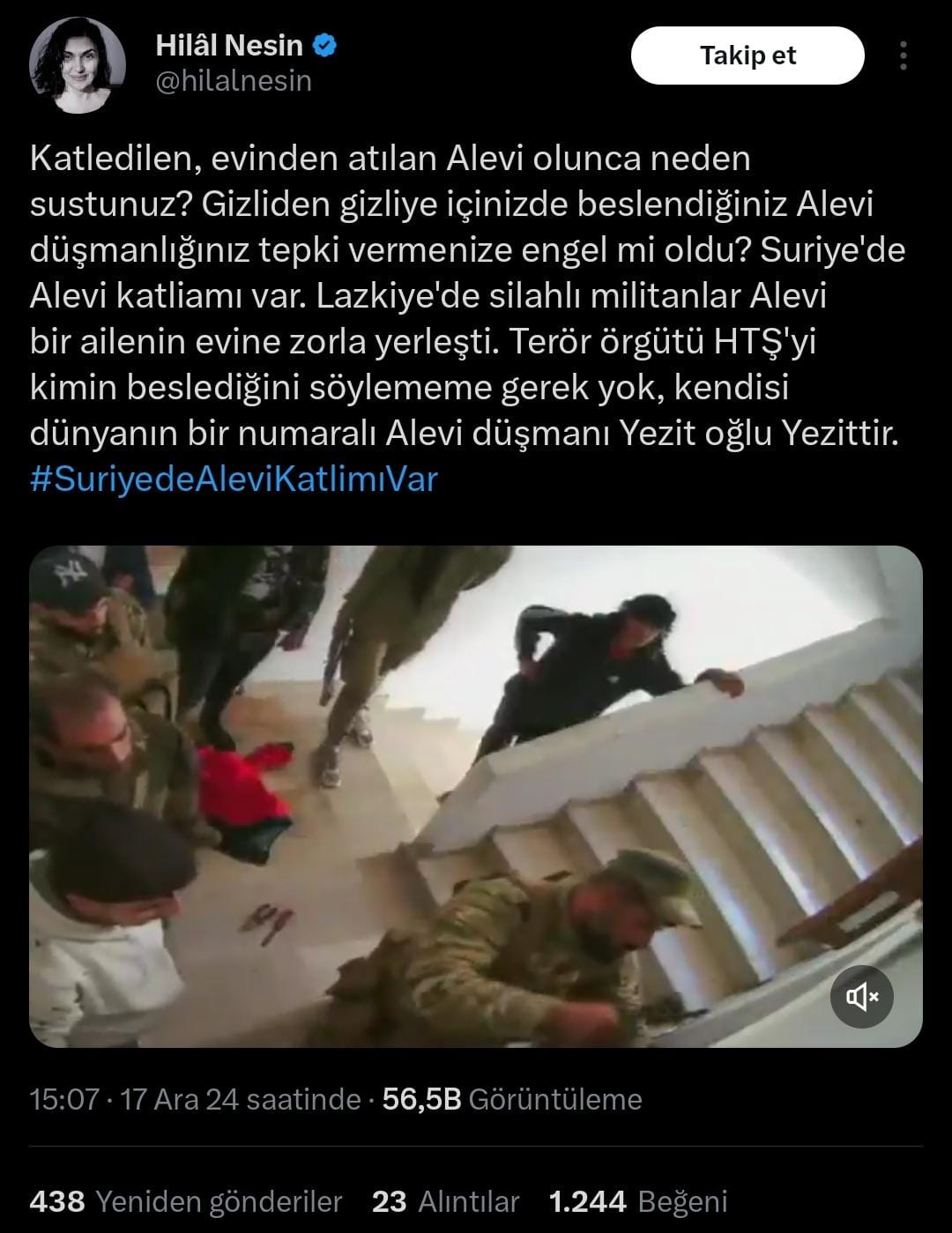BBC’de yayınlanan iddiaya göre Lazkiye'de alevi bir ailenin evine silahlı bir grup zorla yerleşmiş ve HTŞ'li mücahitlerin olaya müdahalesiyle alevi kadının mağduriyetine engel olunmuş ama sosyal medyaya bakarsanız büyük bir alevi katliamı söz konusu.