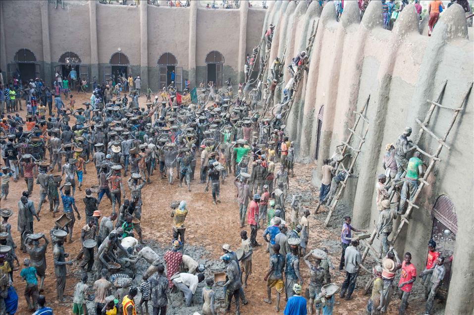 Mali'de Toprak Camiyi Çamurla Tamir Ediyorlar