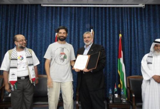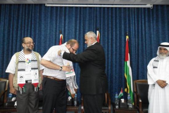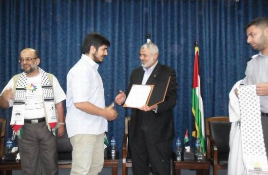 Mavi Marmara gazilerine plaket ve imzalamış olduğu Filistin atkısı takdim eden İsmail Heniyye, sanatçı Mikail'in seslendirdiği Unadikum ezgisine de eşlik etti.