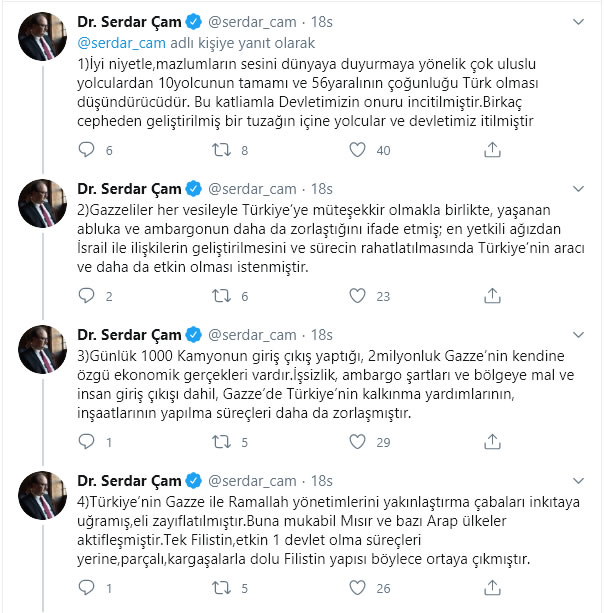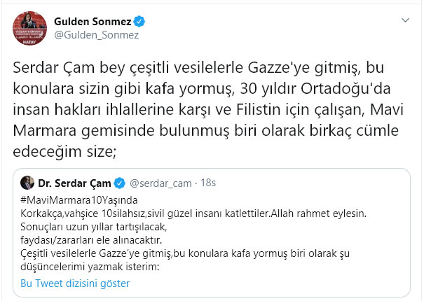 Mavi Marmara avukatlarından Gülden Sönmez ise Twitter hesabı üzerinden Serdar Çam’a tepki gösterdi. Çam’ın iddialarının birbirine zıt ve çelişkili olduğunu belirten Sönmez, Gazze’deki durumun daha kötüleşmesinin Mavi Marmara saldırısından sonrasında olmadığını ifade etti.