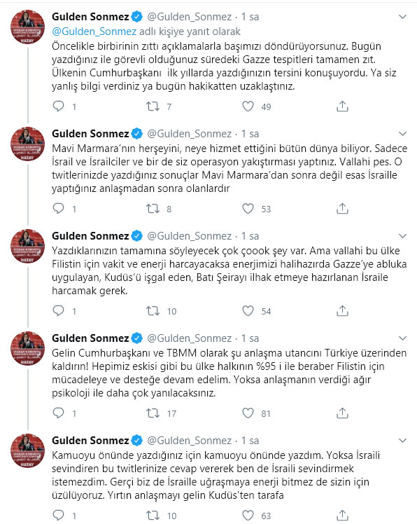 Türkiye ve İsrail arasındaki anlaşma neticesinde Mavi Marmara davasının düşmesiyle Gazze’nin durumunun daha da kötüleştiğini kaydeden Sönmez, Çam’ın ya yanlış bilgi verdiğini ya da hakikatten uzaklaştığını beyan etti.