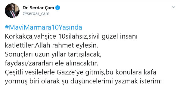Serdar Çam, sosyal medya hesaplarından yaptığı açıklamada, Mavi Marmara’ya yapılan saldırıda, 10 Türk vatandaşının şehit olması ve 56’sının da yaralanmasının tesadüf olmadığını iddia etti.