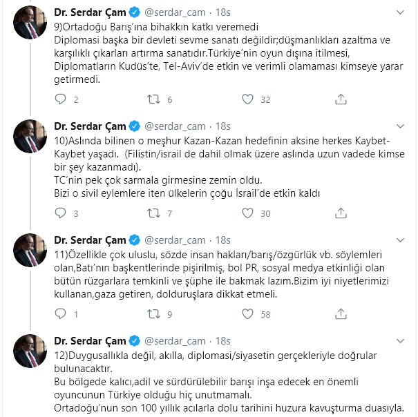 Filistin meselesinin diplomasiyle çözülmesi gerektiğini vurgulayan Çam, iktidarın şu anki rüzgarına bakarak rahatça analiz kasabiliyor! Merak ediyoruz, acaba Serdar Çam, Cumhurbaşkanı Recep Tayyip Erdoğan’ın Mavi Marmara seferinin arkasında olduğunu söylediği dönemde yine böyle rahatça konuşur muydu? Neyse belki Serdar Bey mevzuyu diplomasiyle çözecek!