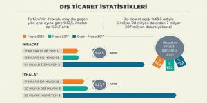 Türkiye'nin ihracatı, mayısta geçen yılın aynı ayına göre yüzde 12,5 artarak 13 milyar 616 milyon dolar, ithalatı yüzde 21,7 artarak 20 milyar 923 milyon dolar olarak gerçekleşti.