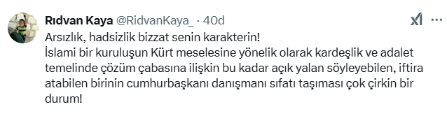 Büyükşehir belediyelerinin kaybedilmesinden, AK Parti teşkilatlarının halktan uzaklaşmasına neden olan; liyakatsiz, kibirli kişilerin AK Parti ve Cumhurbaşkanı Erdoğan’a kaybettirdiğini, tam bir çürüme alanı oluşturduğunu ve acilen bunlardan uzaklaşılması gerektiğinin bilinmesine rağmen bu tipler köşe başlarını tutmaya bu mücadelenin bedelini ödemiş kişi ve kurumlara nizamat vermeye-tehdit etmeye devam etmekteler. Bunu yaparken de her türlü çirkefliği ve arsızlığı kullanmaktalar.
