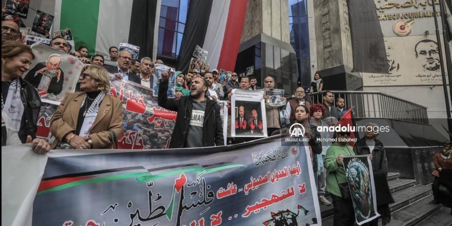 Mısır'ın başkenti Kahire'deki Gazeteciler Sendikası binası önünde toplanan sendika üyeleri, İsrail'in Gazze Şeridi'ne düzenlediği saldırıları protesto etti. Filistin bayrakları ve pankartlar taşıyan göstericiler, yardımların Gazze'ye girebilmesi için Refah Sınır Kapısı'nın açılmasını talep etti.