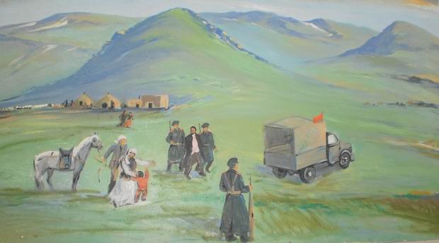 Okulda ilginç bir resimle de karşılaştık. Komünist dönemde bütün imamlar, mollalar ve lamalar (Budist din adamları) toplanıp götürülmüş, sonraki yıllarda bunlara ait toplu mezarlar bulunmuş. Aşağıdaki resim bunu canlandırıyor.