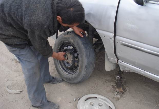 Son sefere çıkmadan önce cami önünde kalabalık bir Moğol grubu toplanmıştı. Dağıtımda sıra oldukça yoksul bir Kazak mahallesindeydi. Yoldaki abartılı derecede çukur ve tepecikler yüzünden tekerimiz patladı. Kazak şoförün ilkel çevirmeli bir kriko ile içi görülen kabak bir tekeri takmasına içim burkularak yardım ettim. Kapı kolları bile olmayan, her tarafı dökülen arabadan daha kötü durumdaki elleri ile şoför, gerçekten mazlum ama neşeli ve heyecanlıydı.