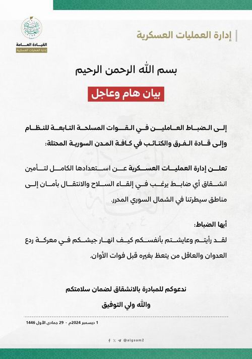 Askeri Operasyon Merkezi, silah bırakmak ve özgür kuzey Suriye’deki bölgelerimize güvenli bir şekilde geçmek isteyen tüm subaylara eman vermeye hazır olduğunu açıklar.