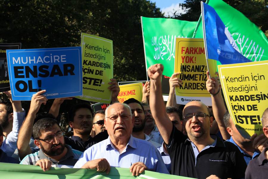 Eylemde, “Muhacire Ensar Ol”, Kendin İçin İstediğini Kardeşin İçin de İste”, “SyrianRefugeesAreOurBrothers&Sisters”, “Milliyetçilik Cahiliyesine Karşı Tek Bir Ümmetiz”, “Farkımız yok! İnsanız, Ümmetiz, Kardeşiz!” dövizleri ile “Muhacirler ‘Yabancı’ Değil Kardeşimizdir!”, “İçişleri Bakanlığının Muhacirlere Yönelik Baskıcı Yasakçı Uygulamalarına Hayır!” ve “Muhacirlere Gardiyan Değil, Ensar Olalım!” pankartları açıldı. “Müslüman Halklar Kardeştir”, “Kahrolsun Irkçılık, Yaşasın Kardeşlik” “Mülteciler Allah’ın Emanetidir!” “Müslüman Uyuma Kardeşine Sahip Çık!” protestocular tarafından sıklıkla kullanılan sloganlar oldu.