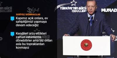 Erdoğan: "Muhacirlik nedir, ensar nedir bunu anlamayanlarla bizim işimiz yok. Biz sevgili peygamberimizin muhacirliğini de ensar olduğunu da biliriz. Suriye’den, savaştan çıkıp ülkemize sığınan bu kardeşlerimize sonuna kadar sahip çıkacağız" dedi.