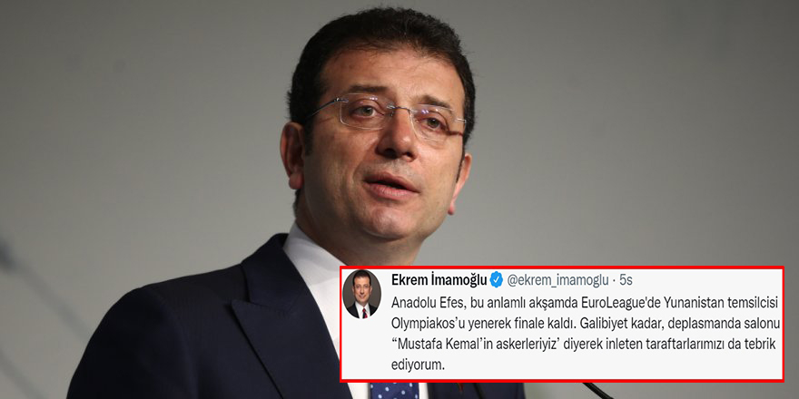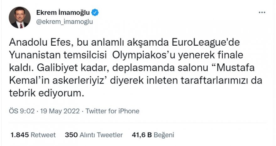 CHP’li Ekrem İmamoğlu sosyal medya hesabından Yunanistan’ın basketbol takımı Olympiakos’u yenen Anadolu Efes’i 19 Mayıs gibi “kutsal” bir günde tebrik ederken şöyle yazdı: “Anadolu Efes, bu anlamlı akşamda EuroLeague'de Yunanistan temsilcisi Olympiakos’u yenerek finale kaldı. Galibiyet kadar, deplasmanda salonu “Mustafa Kemal’in askerleriyiz’ diyerek inleten taraftarlarımızı da tebrik ediyorum.”