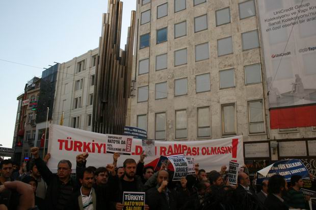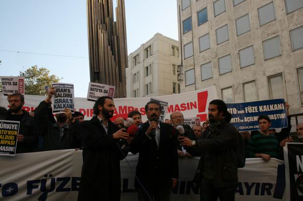 "NATO'nun Füze Kalkanı İslam Ümmetine Açılmış Bir Savaştır!", "NATO'ya ve Füze Kalkanına Hayır!" ve "Türkiye İşgal Üssü Olamaz!" yazılı pankartların açıldığı eylemde "NATO'nun Hedefi: İran'a Saldırı, İsrail'e Kalkan!", "Emperyalist NATO'ya da Katil Füzelerine de Hayır!", "Türkiye NATO'nun Saldırı Rampası Olmasın!" yazılı dövizler taşındı.