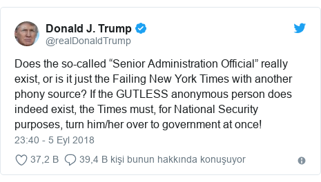 Trump, New York Times gazetesinde yayımlanan makale için 'korkakça' dedi ve yetkiliye sayfalarını açan New York Times'ı da eleştirdi. Trump, "Bu kişi gerçekse, Ulusal Güvenlik gerekçesiyle New York Times bu kişiyi ihbar etmeli" dedi.