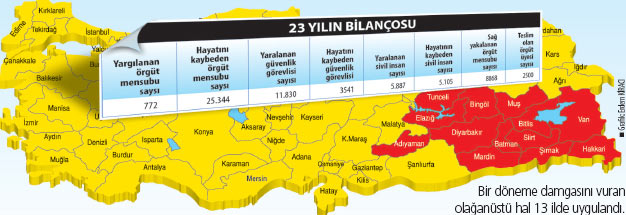 Demokratik Toplum Partisi'nin (DTP) kapatılmasının ardından meydana gelen sokak olaylarıyla tekrar konuşulmaya başlanılan Olağanüstü Hal Uygulaması (OHAL) bir döneme damgasını vurdu. Bazı çevrelerin güvenlik ve asayişi sağlamanın etkin bir yöntemi olarak gördüğü OHAL'in uygulandığı döneme ilişkin, resmi ve gayri resmi rakamlar şiddetin azalmadığını tam tersine arttığını gözler önüne serdi. OHAL'in sürdüğü 23 yılda toplam 33 bin kişi hayatını kaybetti.