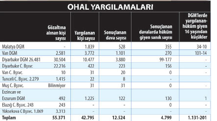 Bir dönem Diyarbakır Baro Başkanlığı'nı da yapan avukat Sezgin Tanrıkulu ile avukat Serdar Yavuz hazırladıkları raporda adeta OHAL uygulamasının rakamlarla resmini çizildi. OHAL Valiliği'nin yetki kapsamında olan yerleşim birimlerinde işkence ve kötü muamele gerekçesi ile toplam 1275 suç duyurusunda bulunuldu. Bu suçlarla ilgili bin 177 soruşturma başlatıldı. Bin 17 kamu görevlisi hakkında 296 dava açıldı. Bu davalardan 60'ı mahkumiyetle sonuçlanırken, 56'sına verilen ceza ise ertelendi. OHAL süresince 55 bin 371 kişi gözaltına alındı. Bunlardan; 42 bin 795 kişi yargılandı ve bu sanıklardan 4 bin 799'u hüküm giydi. Terör suçlusu olarak DGM'de bin 131 çocuk yargılandı ve 201'i hüküm giydi.