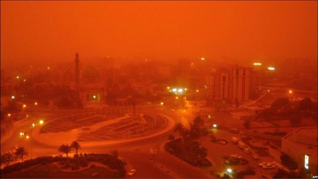 ABD işgal güçlerinin ilerleyişi görüşü birkaç metreye indiren kum fırtınası nedeniyle durdu. ABD güçlerinin kentin 100 kilometre yakınında olduğu haberleri gelirken, Bağdat'ın güneyindeki ağır bombardıman sürdü.