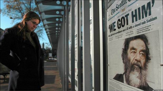 Saddam Hüseyin Aralık 2003'te, memleketi Tikrit yakınlarındaki bir tünelde ABD özel kuvvetleri tarafından yakalandı. Irak'taki ABD Valisi Paul Bremer haberi 'Onu yakaladık' sözleriyle duyurdu.