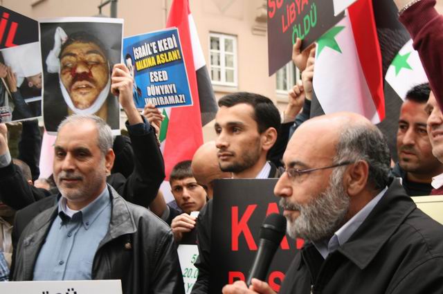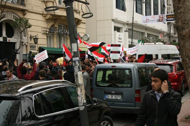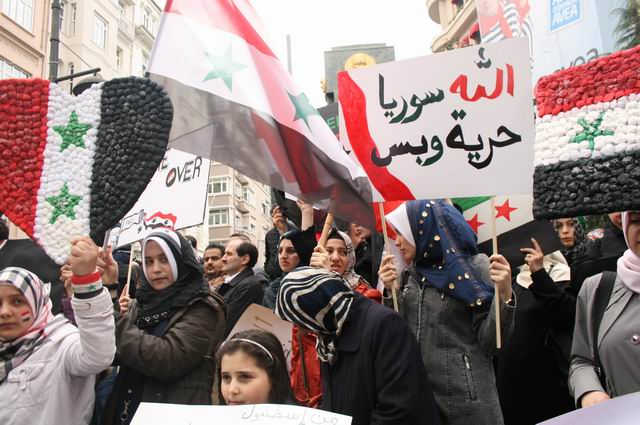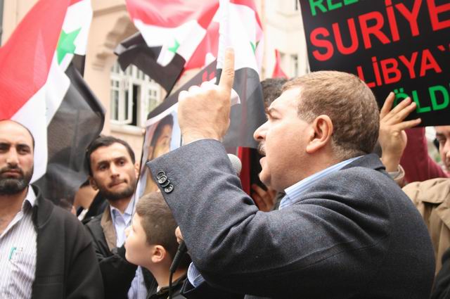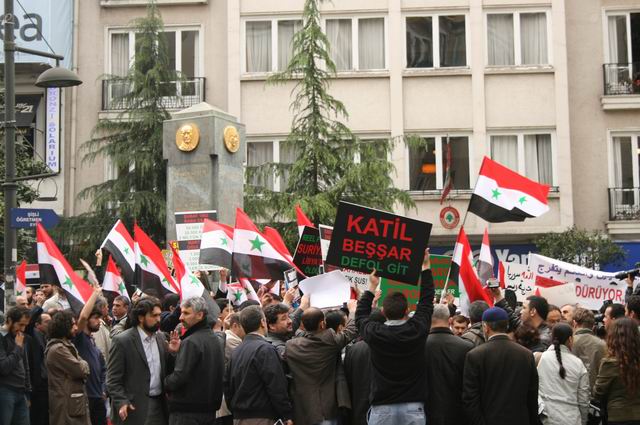 "Suriye Halkı Yalnız Değildir!", "Yaşasın Suriye İntifadası!", "Diktatörler Tek Tek Devrilecek!", "Eş-Şa'b Yuriyd İskat el Nizam!", "Katil Esed Suriye'den Defol!", "Katiller Halka Hesap Verecek!", "Diktatörler Yenilecek İslami Direniş Kazanacak!", "İntifada Ateşi Tağutları Yakacak!", "Müslüman Zulme Boyun Eğmez!" şeklinde sloganların atıldığı eylemde sık sık tekbirler getirildi. Suriyeliler de sık sık Arapça sloganlarla Esed yönetimini kınadılar.