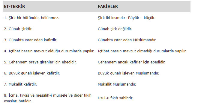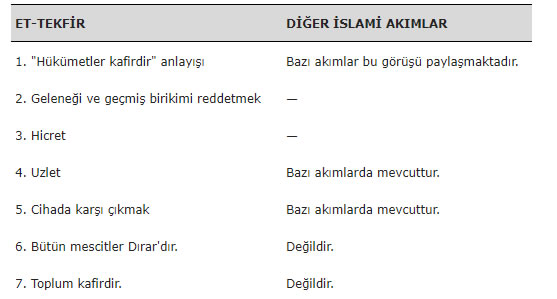 Özel şartların ve Seyyid Kutub çizgisinin en uç noktası olarak tezahür eden et-Tekfir akımı, kimi ilkelerinde genel İslami çizgiye ters düşüyor ve daha çok İslami Fıkıh ekolünün verimsiz ve bıktırıcı konularına takılıp kalarak güvenirliğine gölge düşürüyor.