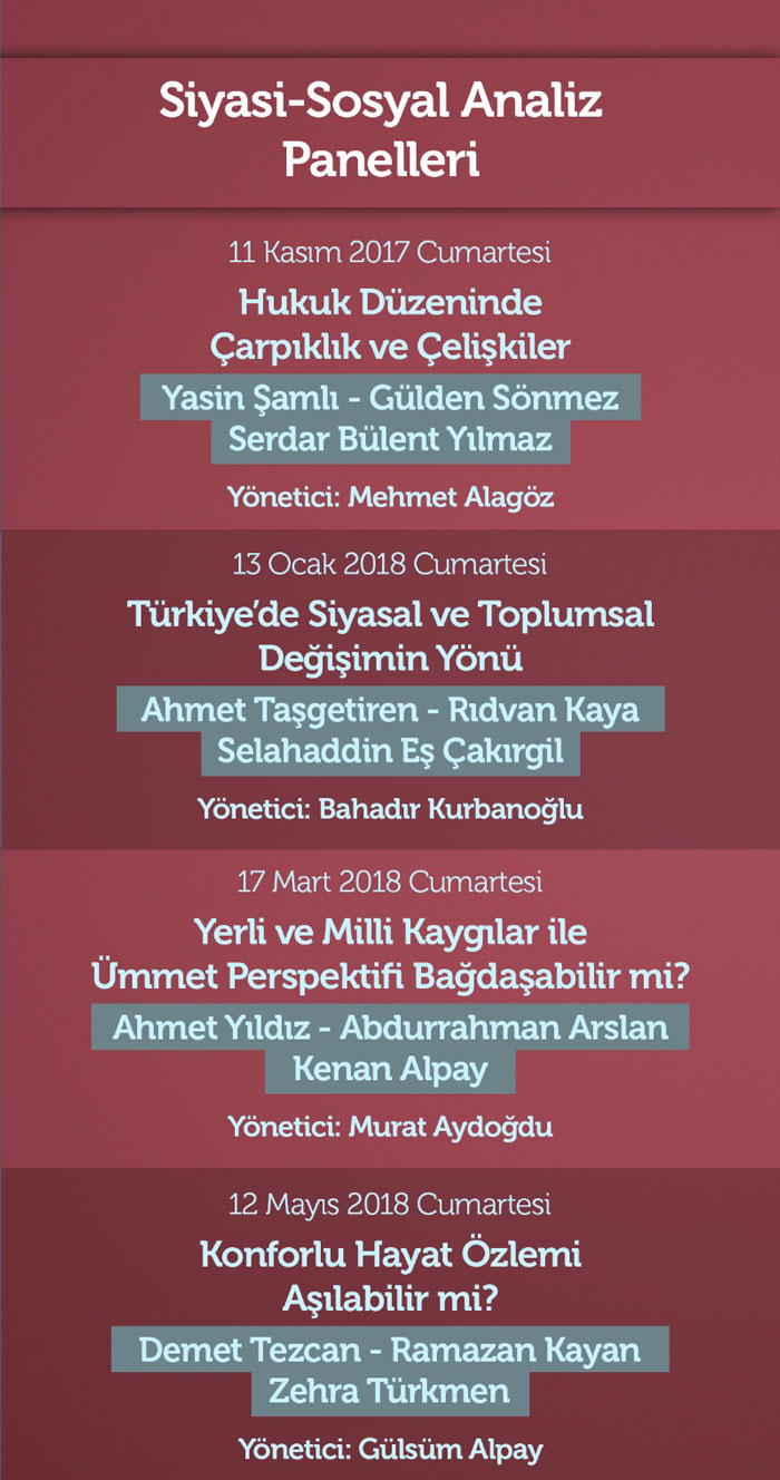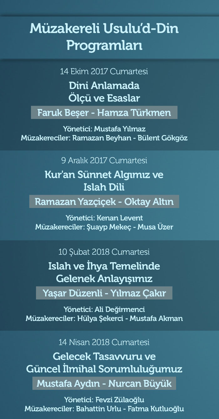 Aylık paneller önümüzdeki Cumartesi akşamı (14 Ekim 2017) gerçekleştirilecek “Dini Anlamada Esas ve Ölçüler” konusuyla başlayacak. Faruk Beşer ve Hamza Türkmen’in konuşmacı olacağı panele Mustafa Yılmaz, Ramazan Beyhan ve Bülent Gökgöz de müzakereci sıfatıyla katılacak. Panel 14 Ekim Cumartesi akşamı saat 20:00’de Fatih Ali Emiri Kültür Merkezi’nde yapılacak.