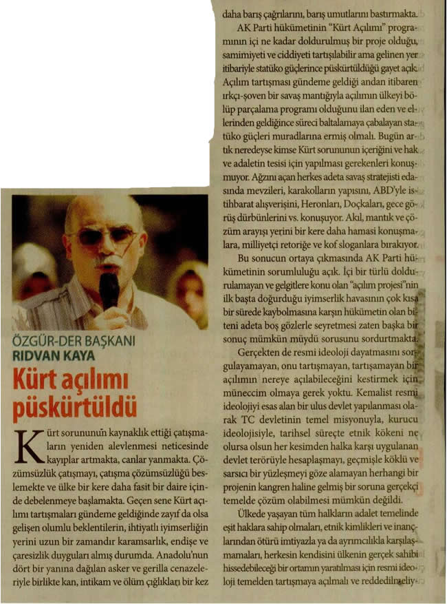 Özgür-Der Başkanı Rıdvan Kaya: Kürt Açılımı Püskürtüldü