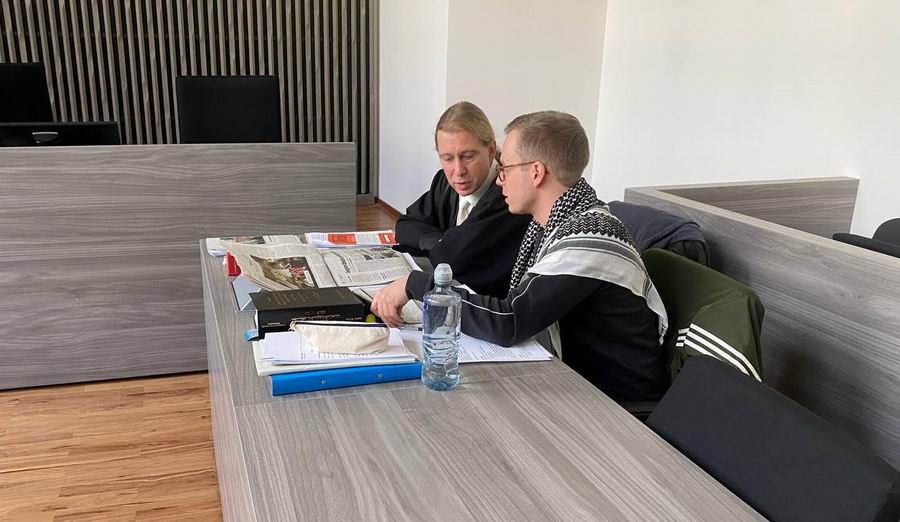 Duruşma başlamadan bir saat önce yaklaşık 40 kişi bir dayanışma mitingi düzenledi. Duruşmanın başlaması planlanan duruşma salonunun çok küçük olması nedeniyle ertelendikten sonra ikinci salonda iddianamenin okunmasının ardından duruşmada 29 yaşındaki sanık Leon Wystrychowski "İntifada" teriminin anlamını ve "Nehirden denize Filistin özgür olacak" sloganının mahiyetini anlattı. Ayrıca, İsrail'in onlarca yıldır Filistin'i işgal etmesi çerçevesinde tarihsel bağlamı içinde yaşananları izah etti.