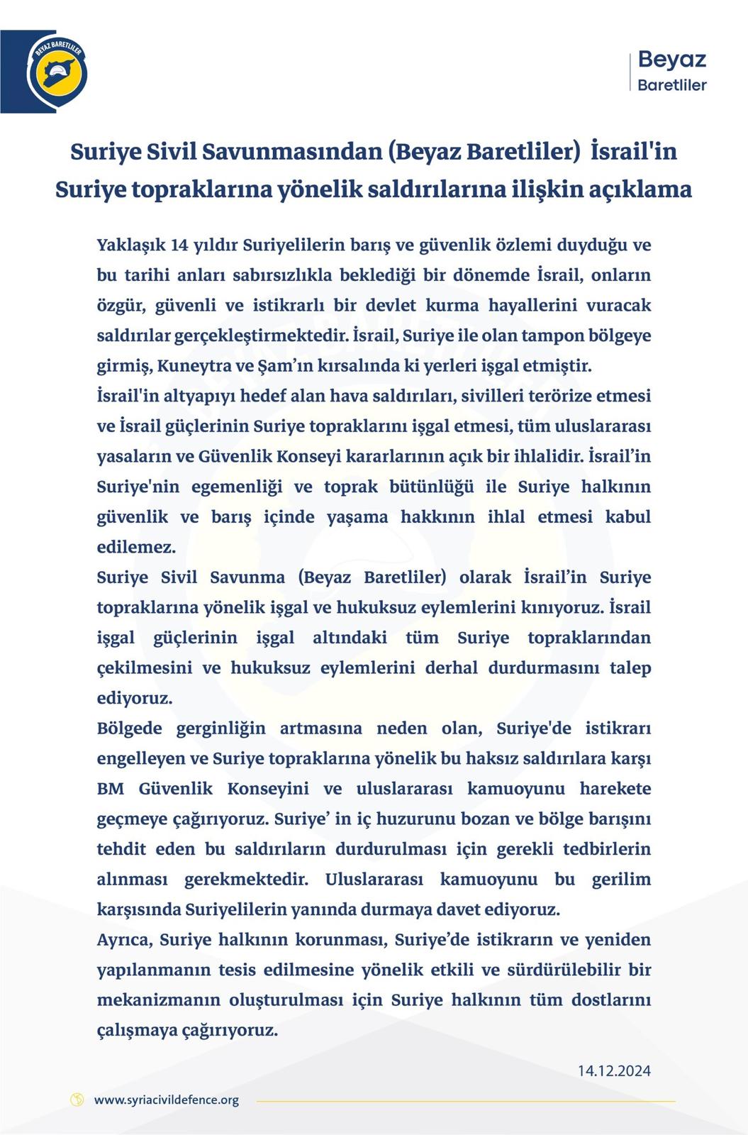 Öte yandan Suriye Sivil Savunması da (Beyaz Baretliler) benzer kulvarda bir açıklama yaparak Siyonist saldırganlığın durdurulması yönünde uluslararası topluma çağrıda bulundu.