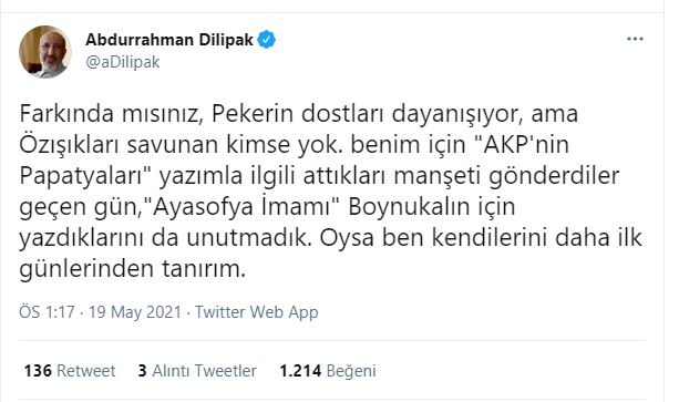 Dilipak, AK Parti Kadın Kolları'nın dava konusu köşe yazısının Hadi Özışık yönetimindeki internethaber.com tarafından hedef alındığını hatırlattı. Öte yandan Hadi Özışık'ın, muhalif kesimin kasıtlı hedefinde olan eski Ayasofya Baş İmamı Prof. Dr. Mehmet Boynukalın'a da bedduasına dikkat çekti.