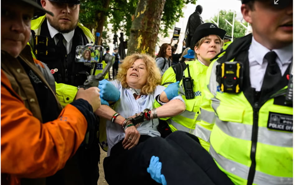 Bazı yerlerde polis çılgına döndü. Örneğin Güney Galler polisi, Cardiff'te barışçıl bir şekilde oturan ve polislerin Filistin Hareketi'ni desteklediğini iddia ettiği pankartlar taşıyan 75 ve 80 yaşındaki iki kadını da dâhil olmak üzere birçok kişiyi tutukladı. Polis, yasanın izin verdiği genişletilmiş gözaltı yetkilerini kullandı, kadınlardan birine kullandığı gerekli ilaçları vermedi, evlerinin kapılarını kırarak içeri girdi, elektronik cihazların yanı sıra Filistin ile ilgili kitapları ve Filistin bayrağını da ele geçirdi ve mutfaklarındaki yiyecekleri radyasyon açısından test ediyor gibi göründü. Açıkçası, Terörle Mücadele Yasası uyarınca tutuklanan biri, muhtemelen bir bomba hazırlamak gibi bir vahşet planlıyor olmalı (kuşkusuz vegan bir bomba).