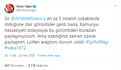 Twitter üzerinden paylaşımda bulunarak koronavirüsten en az 5 insanın sokaklarda öldüğünü iddia eden Sinan Oğan, konuyla alakalı görüntülerin elinde olduğunu öne sürdü.
