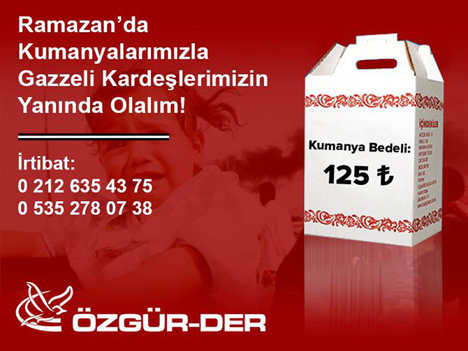 Bu yıl Ramazan ayında Gazzeli muhtaç kardeşlerimiz için kumanya kampanyası başlatan Özgür-Der, duyarlı ve sorumlu kardeşlerimize soframızı paylaşma çağrısında bulunuyor.