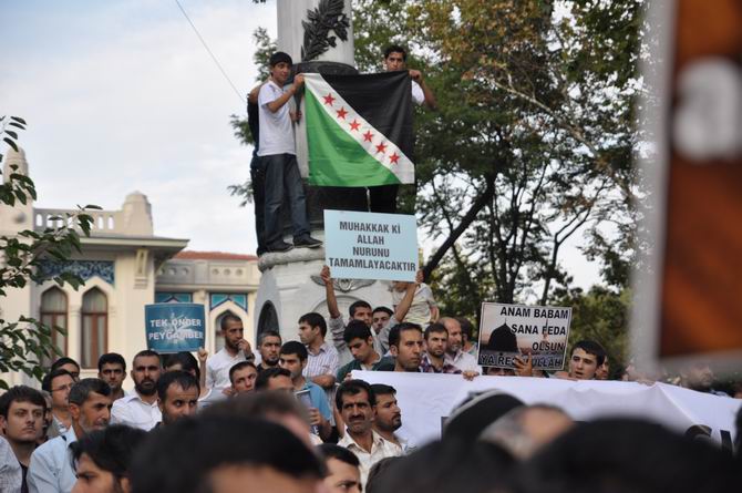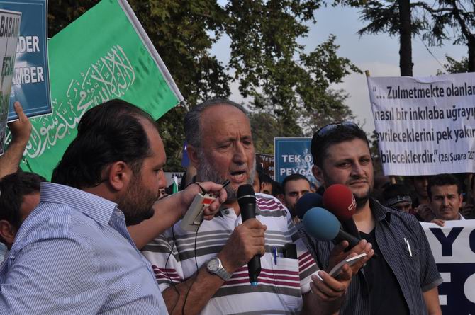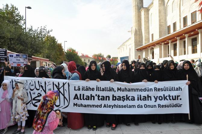 Mehmet Pamak, Cemal Çınar ve Hamza Er’in konuşmacı olduğu eylemde “Peygamber Müminlere Canlarından İleridir!”, “Peygamber ve İslami Değerlere Saldıranları Affetmeyeceğiz!”, “Müslümanlar Yoluna Fedadır Ya Resulallah!”,” Kahrolsun Siyonist İsrail!” pankartları açıldı ve “Ve Şüphesiz Sen Pek Büyük Bir Ahlak Üzerinesin /Kalem 4”, “Anam, Babam Sana Feda Olsun Ya Resulallah!”, “Küfür Tek Millettir!”, “Tek Önder Peygamber!”, “Zalimler İçin Yaşasın Cehennem!”, “Kahrolsun İsrail!”, “Netenyahu/Peres: Döktüğün Kanda Boğulacaksın!”vs. yazılı dövizler taşındı.