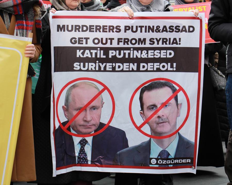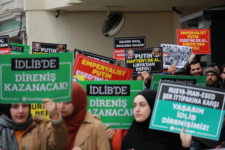 Eylem boyunca “Katil Esed/Putin/Rusya Suriye’den Defol!”, “Katil İran Suriye’den Defol!”, “Yaşasın İdlib Direnişimiz!”, “Mazlumun Hamisi Olanlara Selam!”, “Yaşasın Suriye Direnişimiz!”, “Katil Putin, Katil Hamaney!” ve “Suriye Halkı Yalnız Değildir!” gibi sloganlar atıldı.