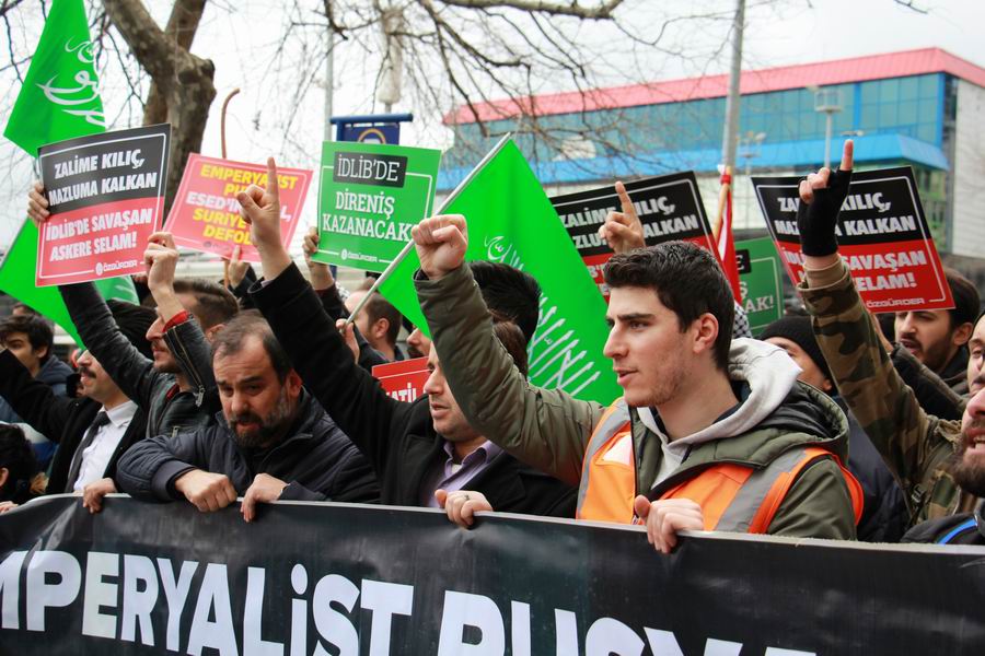 Eylemde “İdlib’te Rusya-İran-Esed Çetesinin Katliamlarına Sessiz Kalmayacağız!”, “Emperyalist Rusya Suriye’den Defol!”, “Mazlumun Yanında, Zalimin Karşısında Savaşan Askerler Ümmetin İftiharıdır!”, “Zalime Kılıç, Mazluma Kalkan. İdlib’de Savaşan Askere Selam!”, “İdlib’de Direniş Kazanacak!” ve “Emperyalist Putin Esed’ini de Al, Suriye’den Defol!” yazılı pankart ve dövizler taşındı.