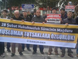 “28 Şubat Hukuksuzluk Sürecinin Mağduru Müslüman Tutsaklara Özgürlük” ve “28 Şubat Darbesi Mağdurlarına Özgürlük-Darbeciler Yargılanırken 28 Şubat Mağdurları neden hala içeride” pankartlarının açıldığı eylemde Muhammed Beydüz ;“Bugün 28 Şubat. Üzerinden 18 yıl geçmiş olmasına rağmen etkilerinin ve mağduriyetlerinin giderilemediği bir darbenin yıldönümü bugün.” diyerek başladığı açıklamasına