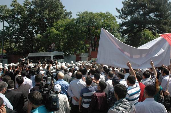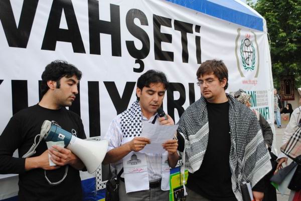 Protesto gösterileri aynı yerde hala devam ediyor. Daha önce gösteriye müdahale etmeyen polis bu sabah saatlerinde katılımın azalmasını fırsat bilerek kardeşlerimize müdahale etti. Çok kalabalık bir ekiple yaklaşık 15 kişilik gruba çok sert bir şekilde müdahale eden polis gemideki savunmasız kardeşlerimize yaptığı müdahaleyle Siyonist askerleri aratmıyordu. Göstericileri yaklaşık 50 m. sürükleyen polis bu arada yumruklarla, coplarla kardeşlerimizi feci şekilde dövdüler bazı kardeşlerimiz hastaneye kaldırılırken diğerleri hafif yaralarla bu saldırıyı yakında bulunan Seğmenler parkına sığınarak atlattılar. Buna rağmen gösteriler hala devam etmekte.