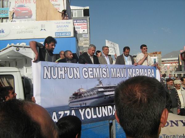 Erciş Kara Yusuf(Büyük Camii) Camiinde kılınan ikindi namazından sonra bir araya gelen Müslümanlar adına ilk önce Nedim Sağlam basın açıklamasını okudu. Daha sonra da, Gültekin KELEŞ 'Gemide ki Filistin dostlarının tümünün dönüşüne kadar eylemlilik halinin devam edeceğini söyledi.Sık sık tekbirlerle kesilen konuşmalar sonrası Nurbay AYDIN son yaşanan gelişmeleri değerlendirdi ve dua okudu.