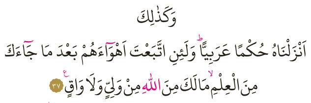 “Böylece Biz Kur’an’ı Arapça bir hüküm ve hikmet olarak indirdik. Sana ilim geldikten sonra onların heveslerine uyarsan, andolsun ki, Allah katında sana bir dost ve seni koruyan çıkmaz.” (Rad-37)