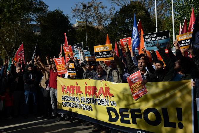 Tevhid bayraklarının yanı sıra Halid Meşal ve İsmail Heniyye’nin Gazze’de Özgür Suriye bayrağını dalgalandırdıkları fotoğrafların taşındığı eylem boyunca “Mescidi Aksa Onurumuzdur!” “Katil İsrail Filistin’den Defol”, “Siyonist Elçilik Kapatılsın!” “Kahrolsun İşbirlikçi Hainler!” “Halep’e Kudüs’e Direnişe Bin Selam!” “Katil ABD Ortadoğu’dan Defol!” “Katil Rusya Suriye’den Defol!” “Katil İran Suriye’den Defol!” sloganları atıldı ve sık sık tekbir getirildi.