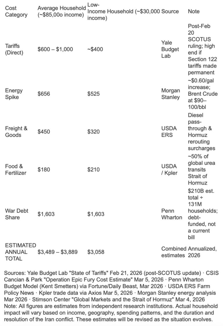 Peki bütün bunlar gerçek insanlar için ne anlama geliyor? Yıllık yaklaşık 85.000 dolar kazanan ortalama bir aile için, çatışmanın bugüne kadarki ekonomik etkileri ve gümrük vergilerinin yarattığı baskı hesaba katıldığında yılda yaklaşık 3.489 ile 3.889 dolar arasında ek bir yük ortaya çıkıyor. Yaklaşık 30.000 dolar gelir elde eden düşük gelirli aileler için ise bu maliyet 3.000 doların üzerine çıkıyor. Üstelik bu rakamlar, bu ailelerin karşı karşıya kaldığı toplam maliyetin tamamını bile yansıtmıyor.