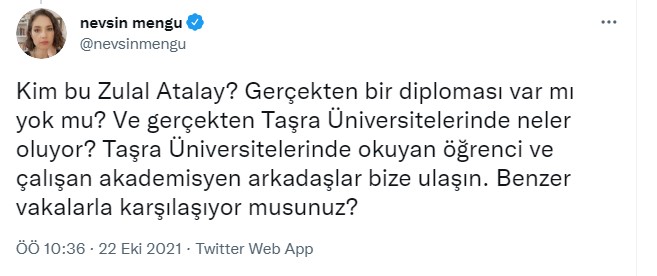 Nevşin Mengü Twitter hesabından şunları yazdı: "Aksaray Üniversitesi'ne gelen yeni bir akademisyen diğer akademisyenlerin dikkatini çekti. Üniversite'de Ankara'dan 'yukarından' bir tavsiyeyle atandığı söylenen Zehra Zulal Atalay Laçin.