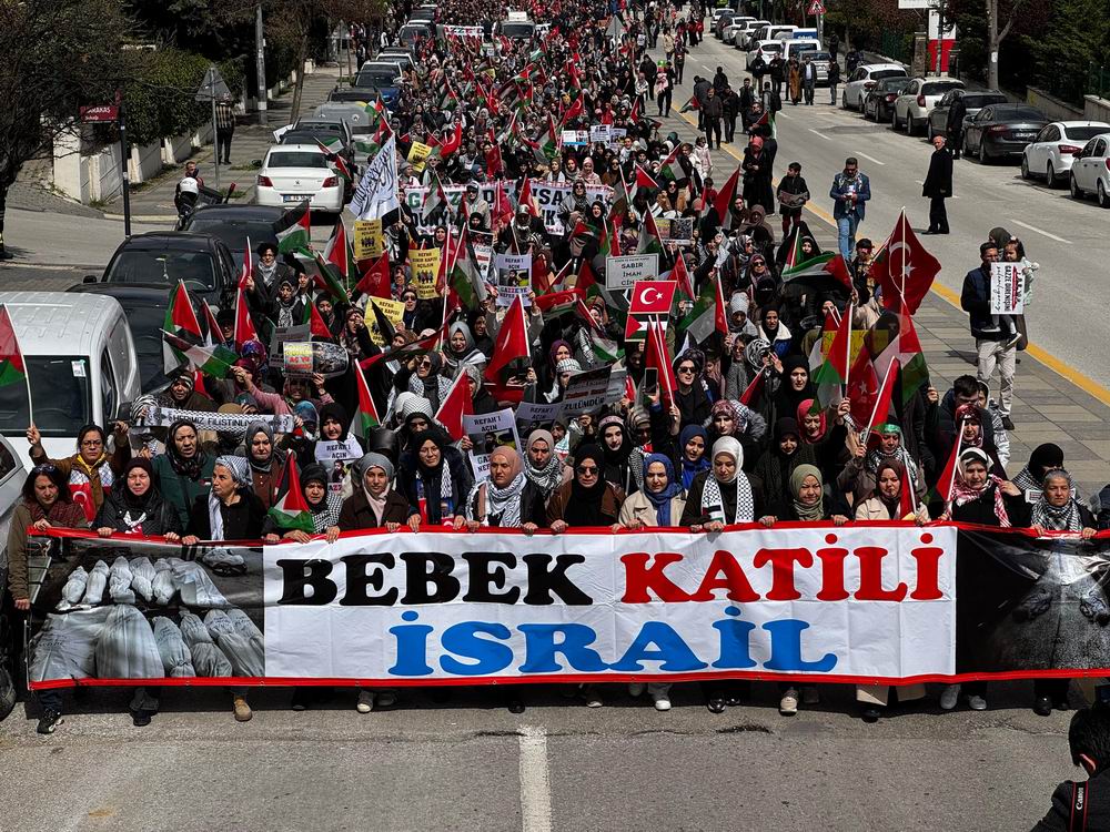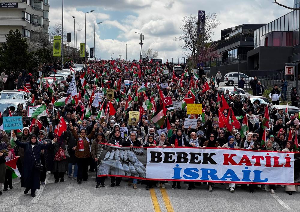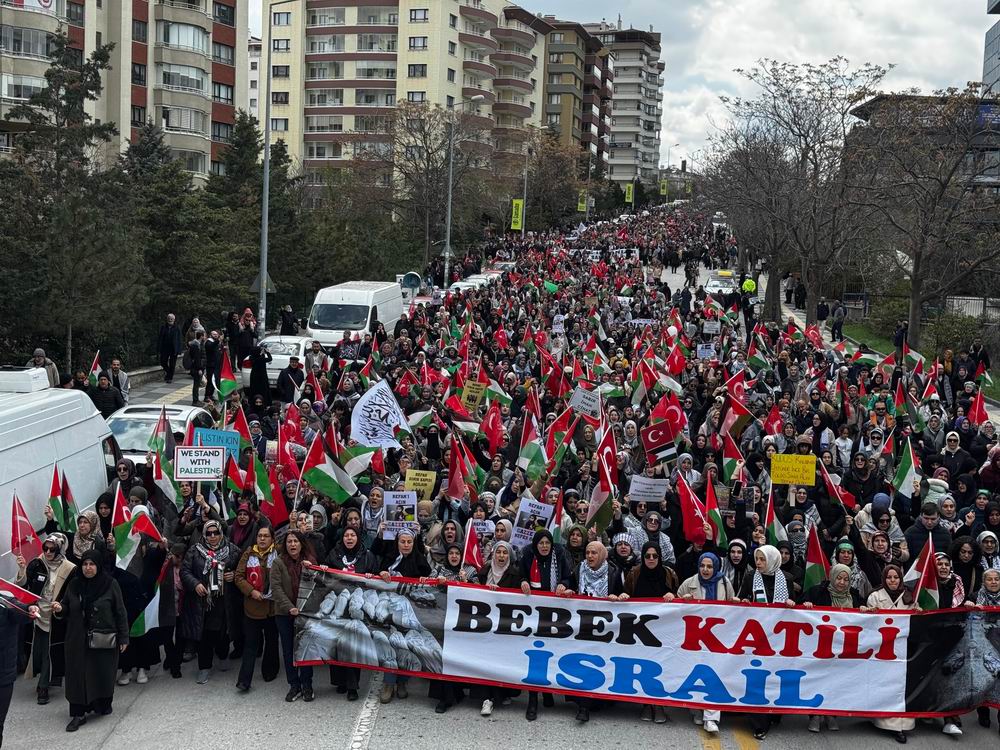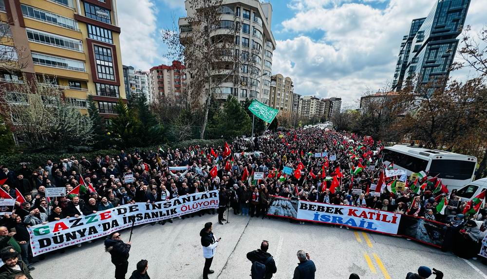 Buradan “Katil İsrail, katil ABD”, “Ankara’dan Gazze’ye direnişe bin selam” ve “Katil Amerika Ankara’dan defol” sloganlarıyla ABD Büyükelçiliğine yürüyen binlerce kişi, “Bebek katili İsrail” ve “Gazze’de insanlar, dünyada insanlık öldü” pankartlarını açtı.
