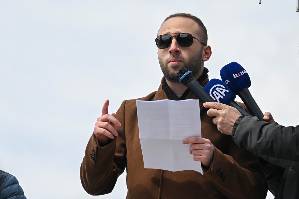 Büyükelçilik önünde konuşan Filistinli öğrenci Abdurrahman İsam, Gazze’deki soykırımın üzerinden 554 gün geçmesine rağmen Siyonistlere diz çökmediklerini söyledi.