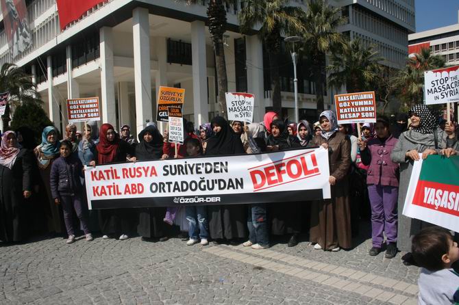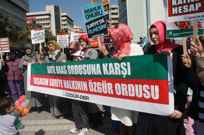 Özgün-Der, İZYAD, Mazlum-Der İzmir Şubesi, Çağrı-Der tarafından da desteklenen eylemde “Suriye'de Vahşet Sürüyor: Sessiz Kalmak Suç Ortaklığıdır! Katliamı Durdurun”, “Katil Baas Ordusu'na Karşı Yaşasın Suriye Halkının Özgür Ordusu”, “Birinci Yıldönümünde Suriye İntifadası'na Bin Selam”, Zulüm, Katliam, İşkence Karşısında Susmak; Baas Despotizminin Suçuna Ortak Olmaktır”, “Katil Baas Çetesinin Karşısında, Kardeş Suriye Halkının Yanındayız” pankartları açıldı.